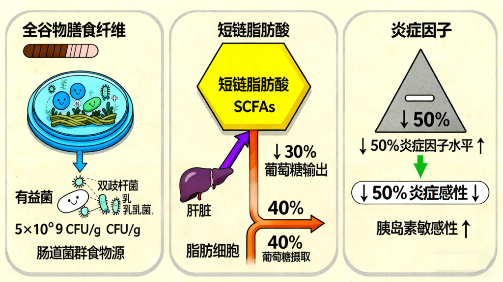 近年来,肠道菌群与糖尿病的关联被广泛研究,而全谷物正是调节肠道菌群平衡的“利器”,能通过肠道健康间接辅助血糖控制。全谷物中含有的膳食纤维(尤其是不可溶性膳食纤维),是肠道有益菌(如双歧杆菌、乳酸菌)的“食物来源”,能促进有益菌增殖,抑制有害菌生长,构建健康的肠道微生态。