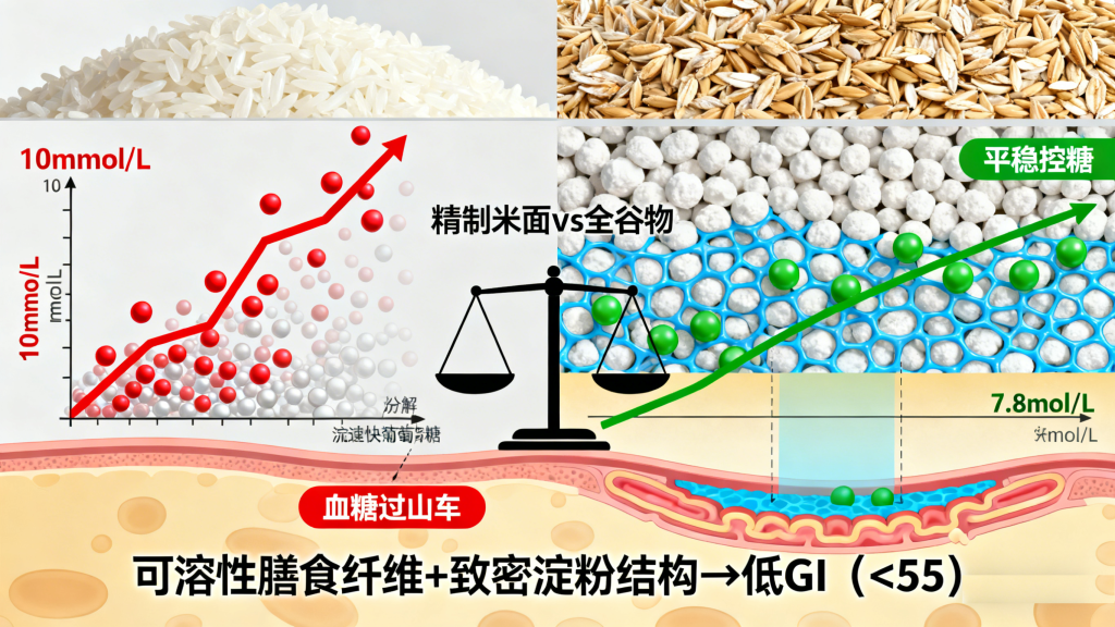 比如,同样食用50克碳水化合物,吃白米饭的餐后2小时血糖可能飙升至10mmol/L以上,而吃燕麦饭的餐后2小时血糖则可能控制在7.8mmol/L以下。此外,全谷物的升糖指数(GI)和升糖负荷(GL)普遍较低,多数在55以下,属于低GI食物,能进一步降低血糖波动的风险,减少对胰岛的刺激。