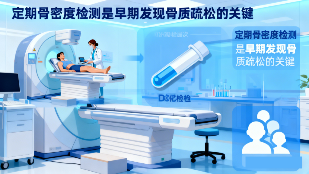 定期骨密度检测是早期发现骨质疏松的关键。建议糖尿病患者每年进行一次双能X线骨密度仪(DXA)检测,这是目前诊断骨质疏松最可靠的方法——若T值小于-2.5标准差,可诊断为骨质疏松;若T值≤-2.5且合并一处及以上脆性骨折,则为严重骨质疏松。此外,还可定期检测血钙、磷、碱性磷酸酶及骨代谢生化标志物,辅助评估骨代谢状态。尤其对于绝经后女性、50岁以上男性、有骨折史或长期使用激素的糖尿病患者,更需加强筛查频率。