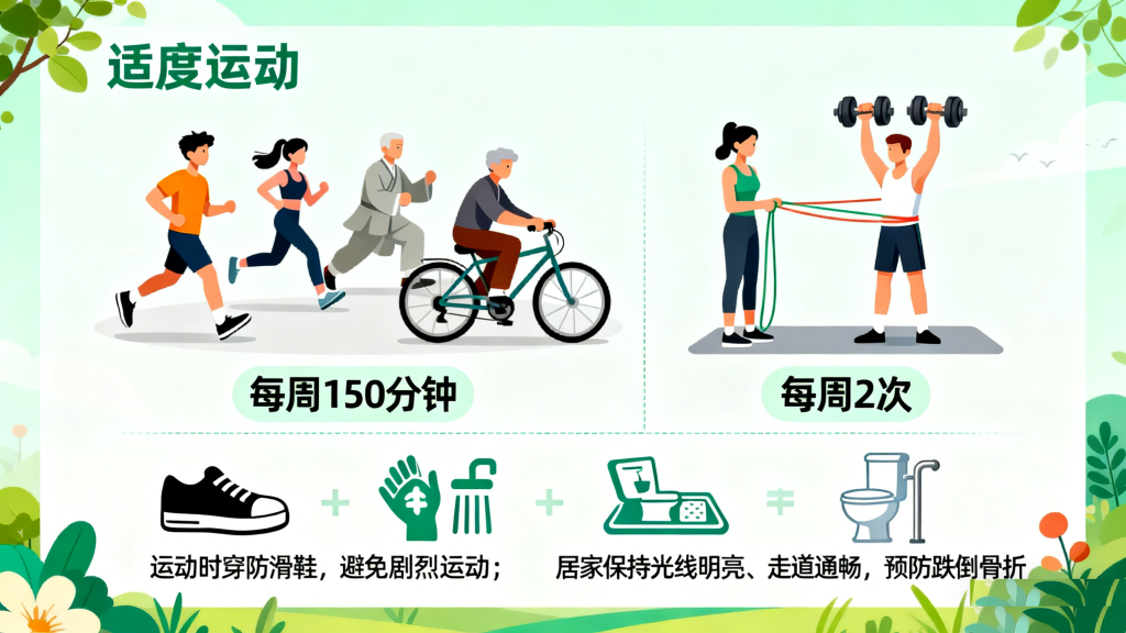 适度运动能刺激骨形成,增强骨密度与肌肉力量,同时改善血糖控制。建议每周进行150分钟中等强度有氧运动,如快走、慢跑、太极拳、骑自行车等,搭配2次抗阻训练,如举哑铃、拉弹力带等。运动时需注意安全:穿防滑鞋,避免剧烈运动;居家环境保持光线明亮、走道通畅,浴室铺防滑垫,马桶旁安装扶手,预防跌倒引发骨折。
