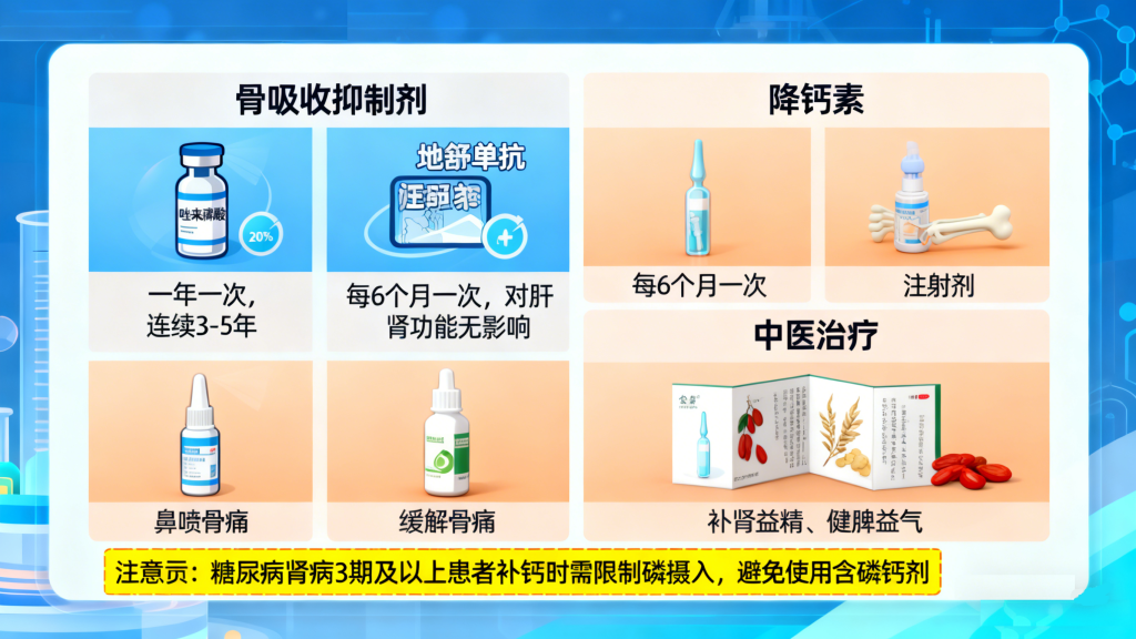 若确诊骨质疏松,需在专科医生指导下使用抗骨质疏松药物。常用药物包括:骨吸收抑制剂(如唑来膦酸,一年注射一次,连续3~5年;地舒单抗,每6个月注射一次,对肝肾功能无影响)、降钙素(可缓解骨痛,有鼻喷剂和注射剂两种形式);中医治疗则以补肾益精、健脾益气为原则,可选用骨疏康胶囊、芪骨胶囊等中成药。需注意,糖尿病肾病3期及以上患者补钙时需限制磷摄入,避免使用含磷钙剂。