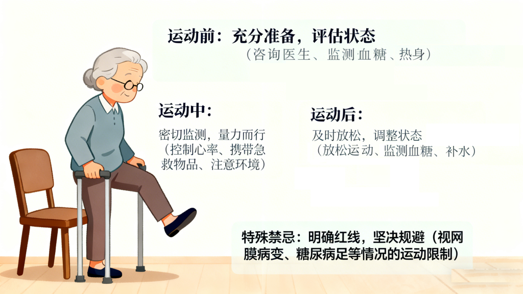 合并以下情况时需减少或避免运动:严重糖尿病视网膜病变(避免剧烈运动、弯腰低头,预防眼底出血);糖尿病足(避免负重运动,选择游泳等无负重方式,同时做好足部护理);严重高血压、冠心病(仅在医生指导下进行低强度运动,避免情绪激动、强度过大);感冒、发烧等急性 illness 期间,暂停运动,待身体恢复后再逐步重启。
