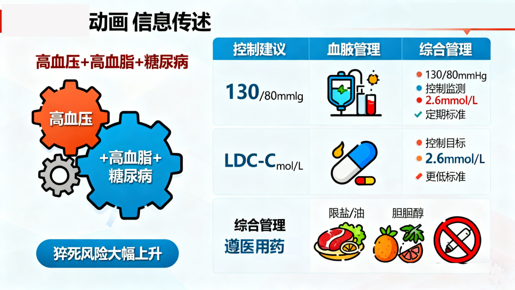 高血压、高血脂是糖尿病患者发生心血管事件的“加速器”,三者共存时,猝死风险会大幅上升。患者需定期监测血压,目标控制在130/80mmHg以下;定期检查血脂,重点关注低密度脂蛋白胆固醇(LDL-C),将其控制在2.6mmol/L以下(合并心血管疾病者需更低)。遵医嘱服用降压、降脂药物,不可自行停药,同时减少高盐、高油、高胆固醇食物摄入,戒烟限酒。