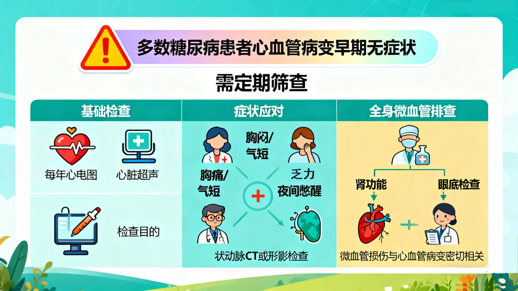 多数糖尿病患者的心血管病变早期无明显症状,需通过定期筛查及时发现。建议每年进行一次心电图、心脏超声检查,评估心脏结构和功能;若出现胸闷、胸痛、气短、乏力、夜间憋醒等症状,需及时做冠状动脉CT或造影,明确血管狭窄情况,尽早干预。此外,还需定期检查肾功能、眼底,排查全身微血管病变,因为微血管损伤与心血管病变密切相关。