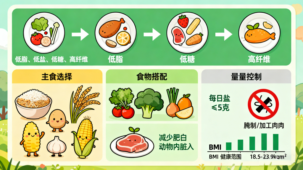 饮食管理不仅是控糖,更是保护心血管的关键。建议遵循“低脂、低盐、低糖、高纤维”原则,主食替换为全谷物(燕麦、糙米、玉米),减少精制米面摄入;多吃新鲜蔬菜、低糖水果,补充维生素和膳食纤维;适量摄入优质蛋白(鱼、虾、禽肉、豆制品),减少肥肉、动物内脏等饱和脂肪和反式脂肪摄入。每日盐摄入量控制在5克以下,避免腌制食品、加工肉类,同时控制总热量,维持健康体重(BMI控制在18.5-23.9kg/m²)。