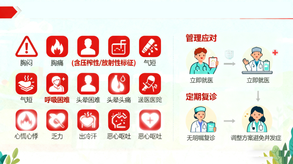 糖尿病患者若出现以下症状,可能是心血管事件的预警信号,需立即就医:胸闷、胸痛(尤其是压榨性、放射性疼痛,持续数分钟不缓解)、气短、呼吸困难、头晕、头痛、心慌、心悸、不明原因的乏力、出冷汗、恶心呕吐等。此外,即使无明显症状,也需遵医嘱定期复诊,调整治疗方案,避免并发症进展。