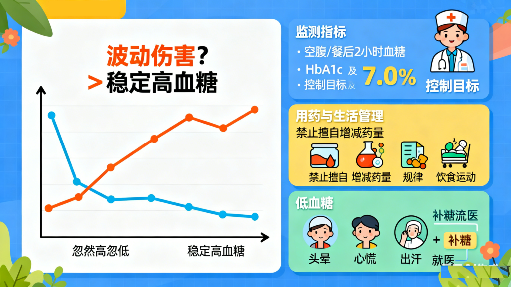 血糖忽高忽低对心血管的伤害远超稳定的高血糖。医生建议,糖尿病患者应定期监测空腹血糖、餐后2小时血糖及糖化血红蛋白(HbA1c),将HbA1c控制在7.0%以下(具体目标可根据年龄、并发症情况调整)。避免擅自增减降糖药或胰岛素剂量,饮食、运动需规律,防止因暴饮暴食、过度节食或剧烈运动导致低血糖,出现头晕、心慌、出汗等症状时,及时补充糖分并就医调整方案。