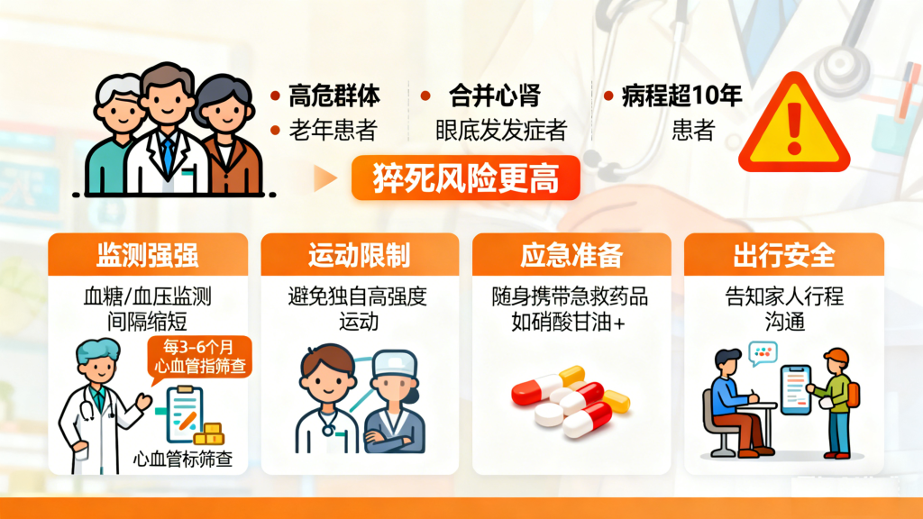 老年糖尿病患者、合并心血管疾病、肾病、眼底病变等并发症者,以及病程超过10年的患者,猝死风险更高,需采取更严格的防护措施:缩短血糖、血压监测间隔,每3-6个月筛查一次心血管指标,避免独自进行高强度运动,随身携带急救药物(如硝酸甘油)和糖果,外出时告知家人行程,以便突发情况时能及时救治。