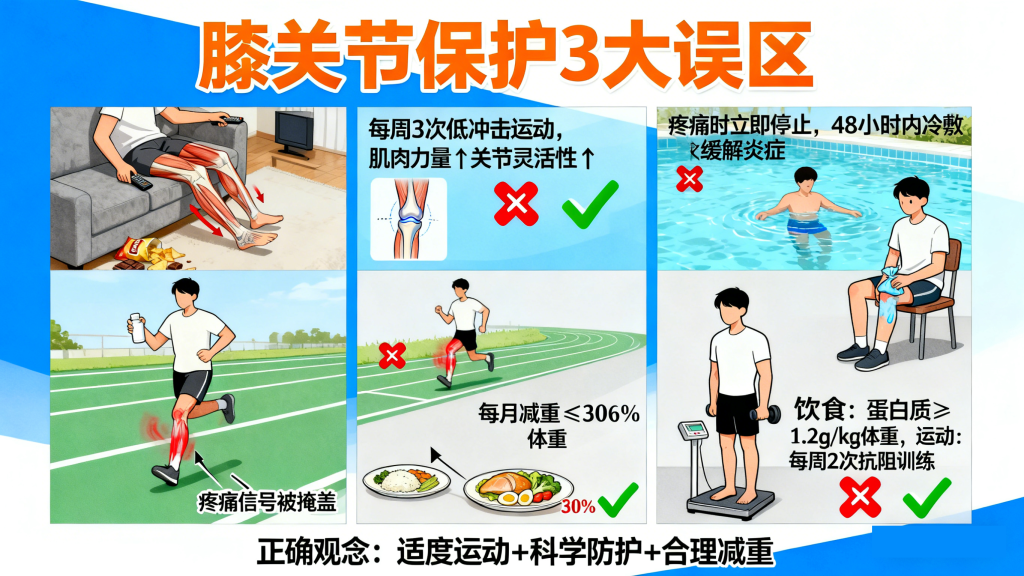 误区一:为保护关节完全不运动。长期不运动会导致肌肉萎缩、关节液循环不畅,反而加剧关节退变,正确做法是选择低冲击运动,维持肌肉力量和关节灵活性。