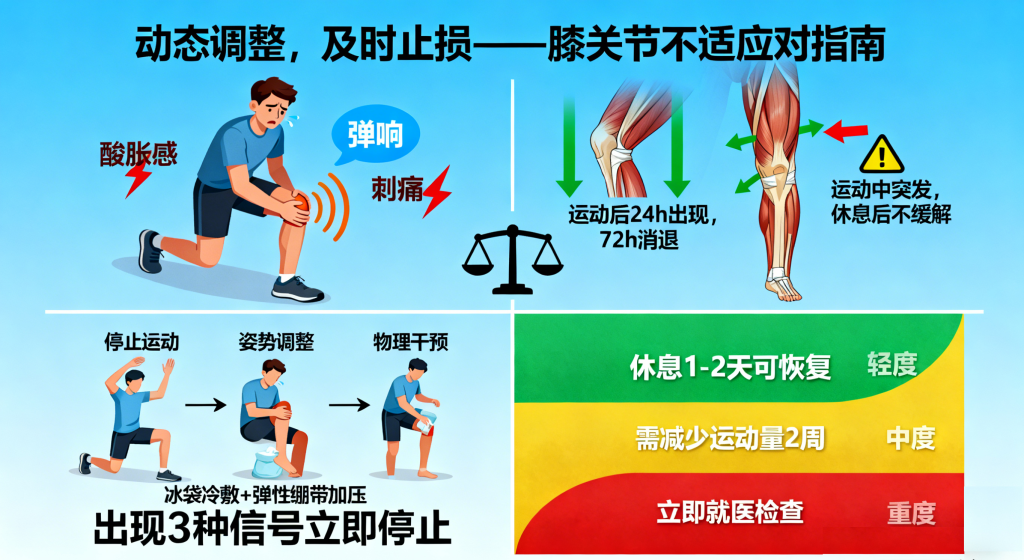 运动中若出现膝关节疼痛、酸胀、弹响等不适,需立即停止运动,不可强行坚持。区分“肌肉酸痛”与“关节疼痛”:肌肉酸痛多在运动后24-72小时缓解,关节疼痛则可能是损伤信号,需及时休息并排查原因。
