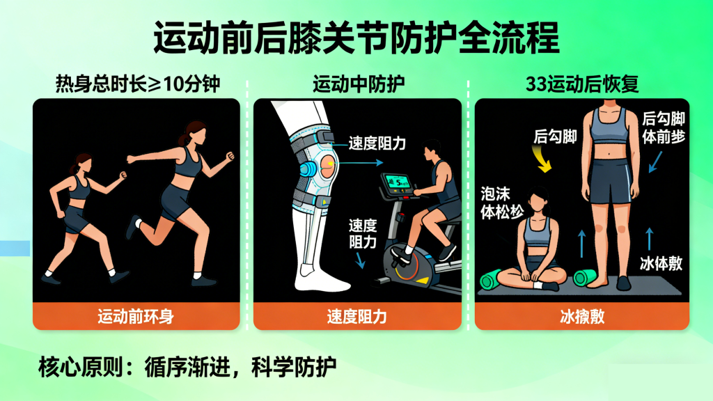 避免直接进行高强度运动,热身时长不少于10分钟。先进行动态拉伸,如高抬腿(小幅度)、弓步走、踝关节环绕,再通过徒手深蹲、臀桥等动作激活膝关节周围肌肉,让关节液充分流动,减少运动中摩擦。